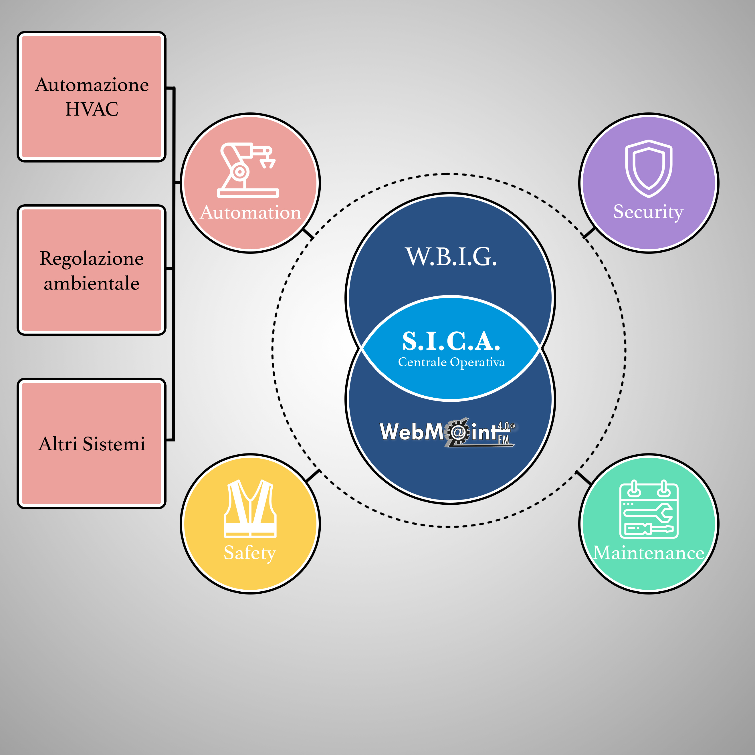 Il Modulo CONTROL ROOM integra i Sistemi e le funzionalità di WebM@int FM 4.0 e del suo Modulo Middleware 4.0, con il Sistema B.M.S. di Campo (Sistema NON nativo,implementato anche autonomamente dal Cliente), per dare vita ad un Sistema unico che trasforma una Application strutturata, ma statica, di Facility Management, in un Sistema di Controllo dinamico ed interattivo, in grado di interagire con gli Impianti Tecnologici con finalità di: